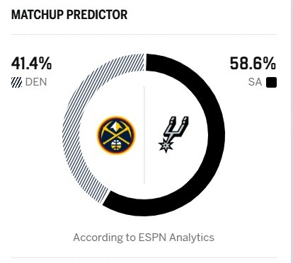 ESPN预测本场比赛胜率:马刺58.6%,掘金41.4%。