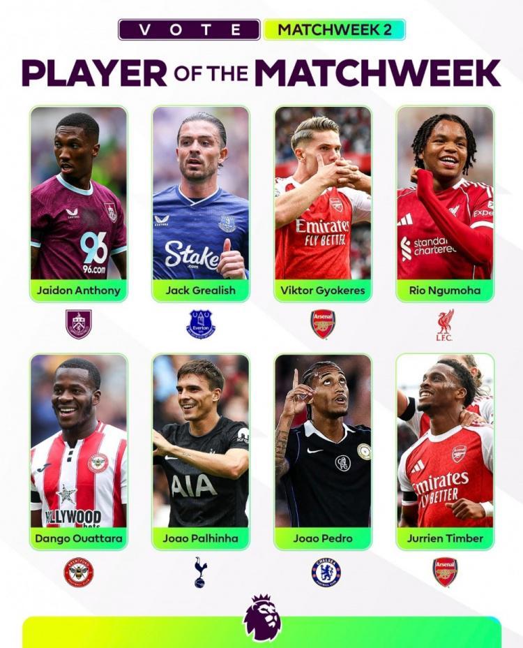 直播吧8月26日讯 英超第二轮战罢,英超官方也列出本轮比赛最佳球员候选名单,具体如下: